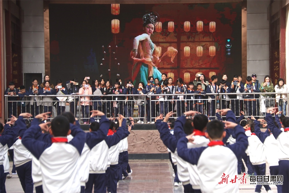 3月21日,香港港大同学会小学研学团的学生在敦煌市北街小学观看特色课间操《敦煌舞》。