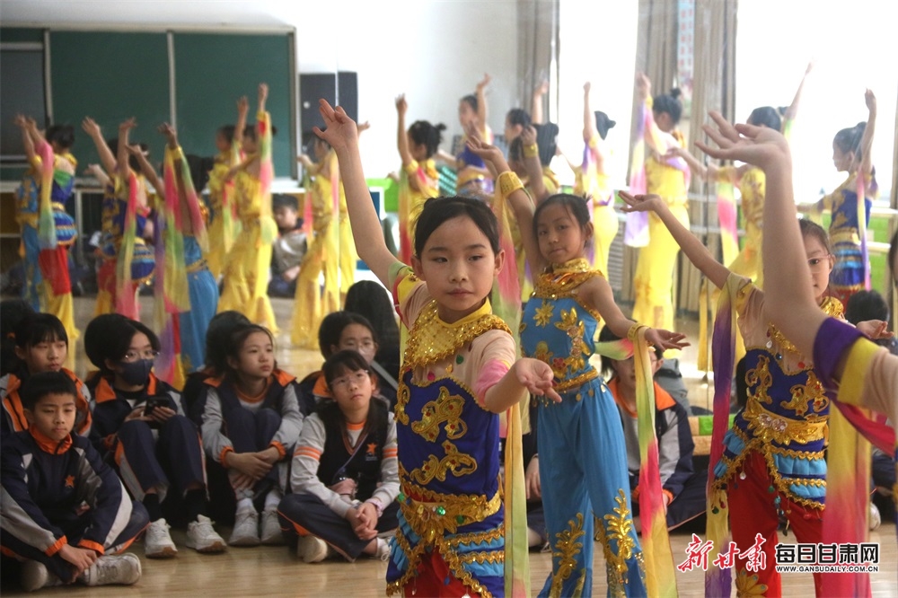 3月21日,香港港大同学会小学研学团学生在敦煌市北街小学观看该校飞天舞蹈社团敦煌舞蹈练习。