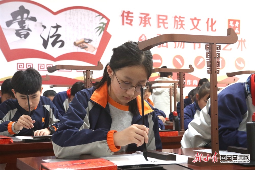 3月21日,香港港大同学会小学研学团、敦煌市北街小学两地学生一同练习书法。