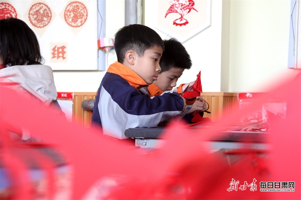 3月21日,香港港大同学会小学研学团学生在敦煌市北街小学学习体验敦煌剪纸。