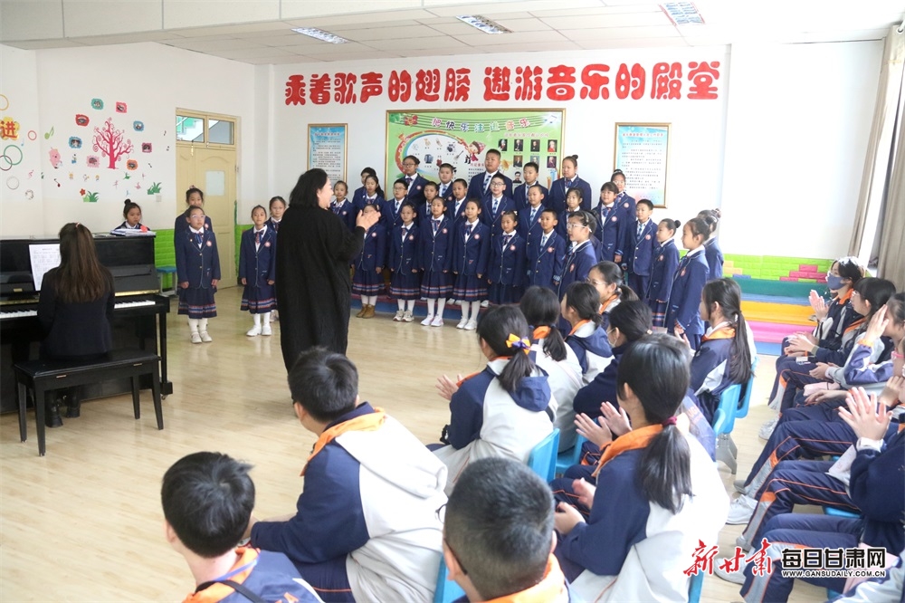 3月21日,香港港大同学会小学研学团学生在敦煌市北街小学观看该校童声飞扬合唱社团合唱练习。