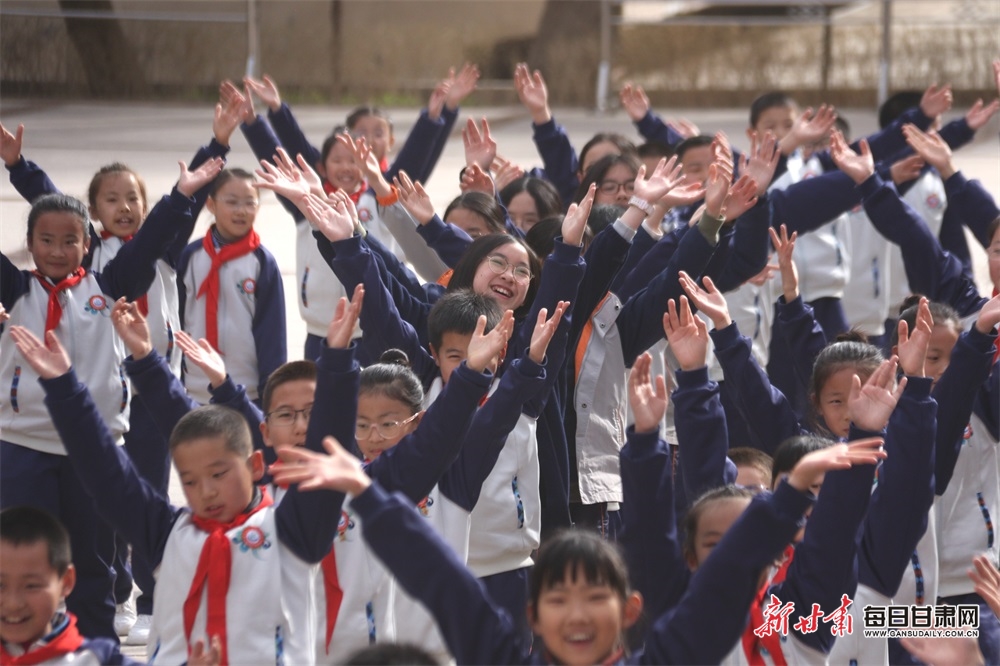 3月21日,香港港大同学会小学研学团、敦煌市北街小学两地学生同跳特色课间操《民族团结一家亲》。