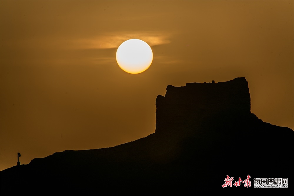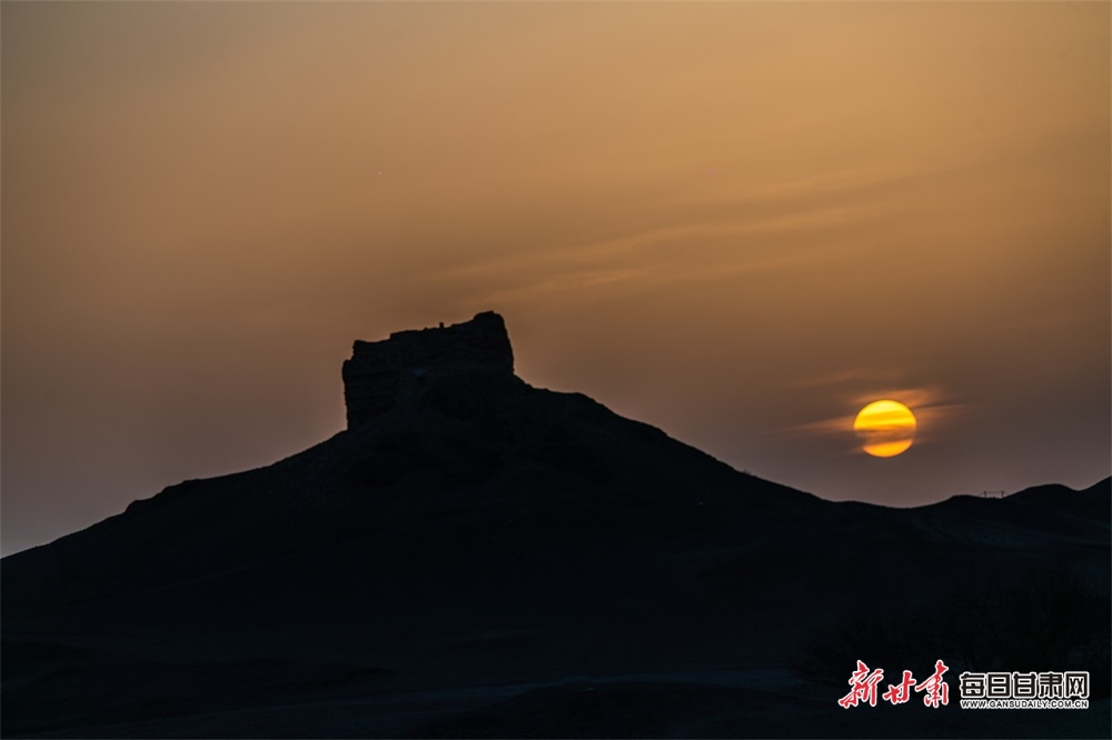 夕阳西下,落日的余晖把大漠戈壁上空的晚霞染成一片金黄。阳关古烽燧下的戈壁滩更显苍茫辽阔,让人产生无限遐想。