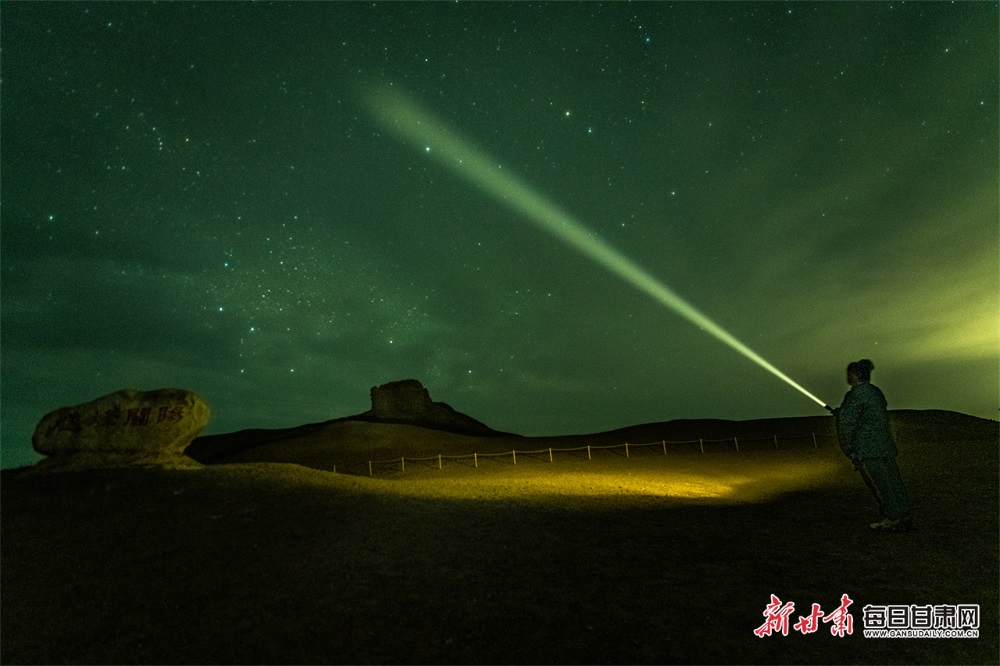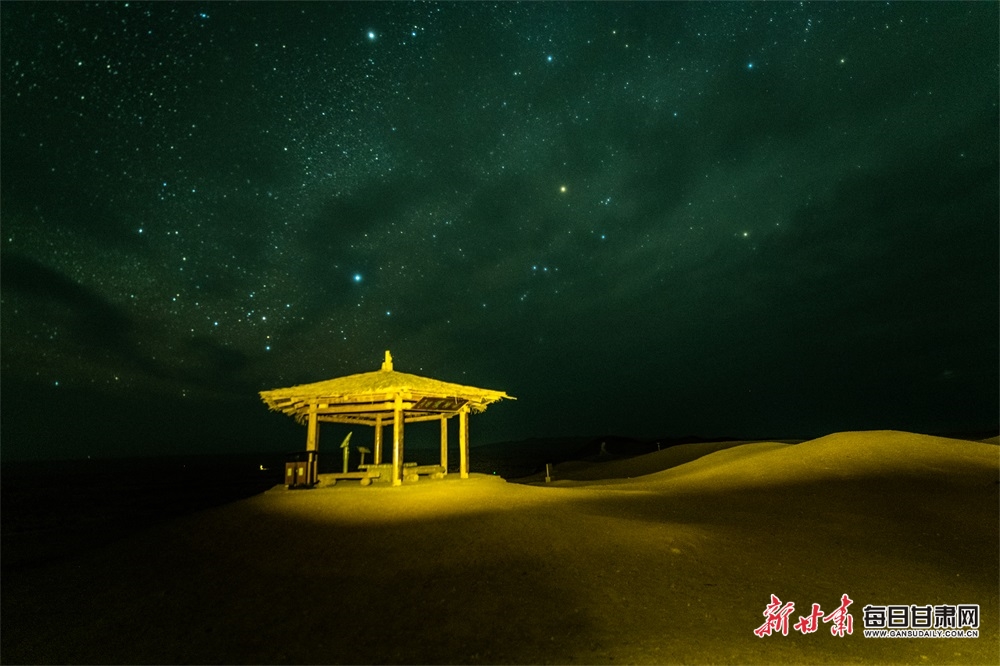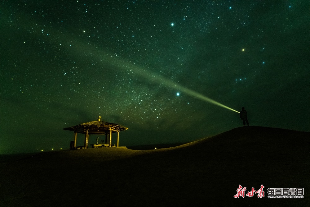 敦煌阳关景区地处偏远的大漠戈壁之上,每当夜深人静,苍茫浩渺的大漠戈壁便呈现星空、星云与流星交织在一起的如梦如幻般的大漠夜景,吸引摄影爱好者和游客观赏拍摄,流连忘返。