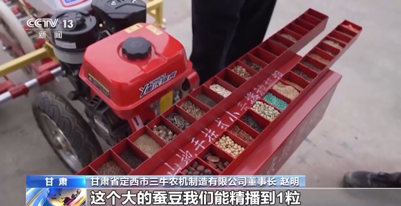 甘肃省定西市三牛农机制造有限公司董事长 赵明:大的蚕豆我们能精播到1粒,和针尖一样大的种子,我们能精播2到3粒,或者是1粒。