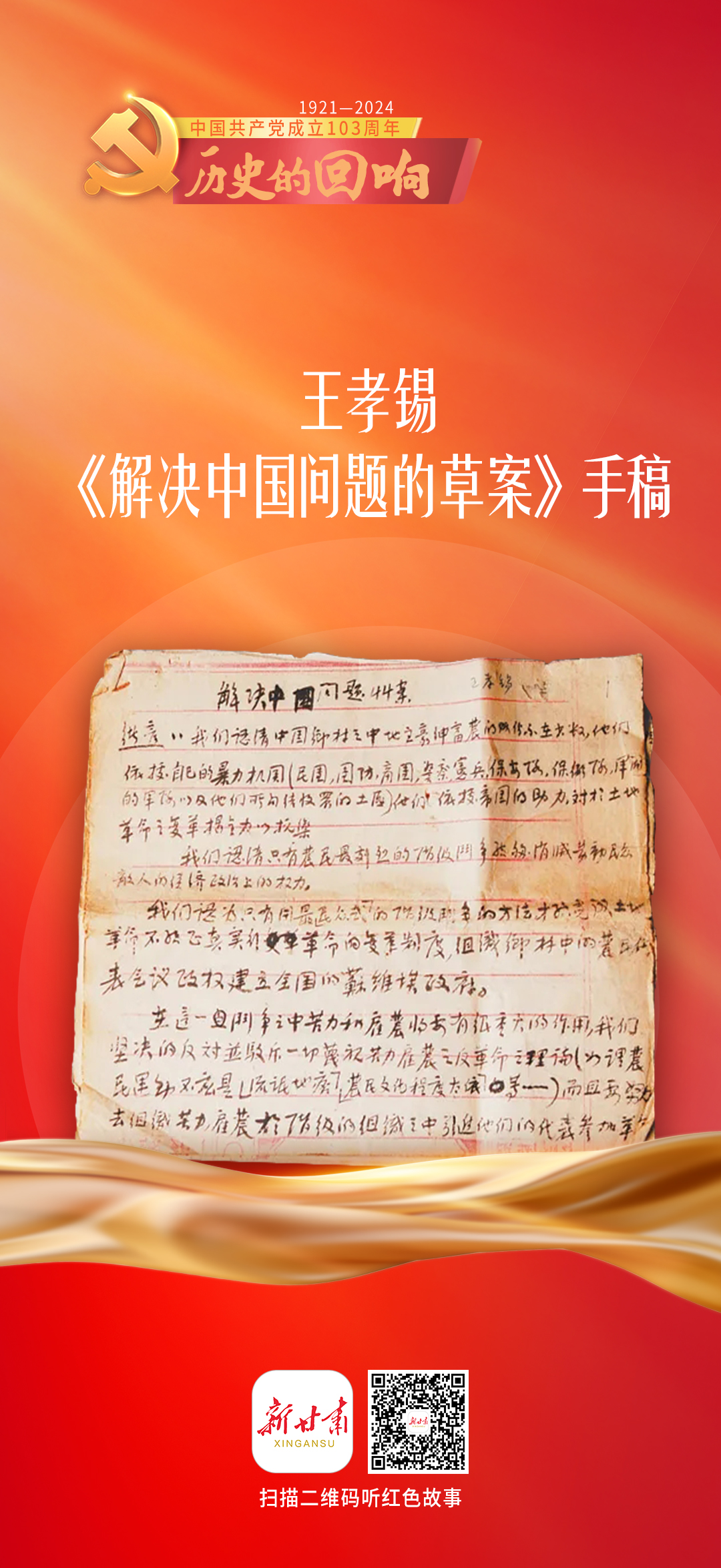 在中国共产党成立103周年到来之际,新甘肃客户端特别策划推出系列有声海报《历史的回响》,为读者讲述红色文物背后感人至深的热血故事,共同追忆往昔光辉岁月。