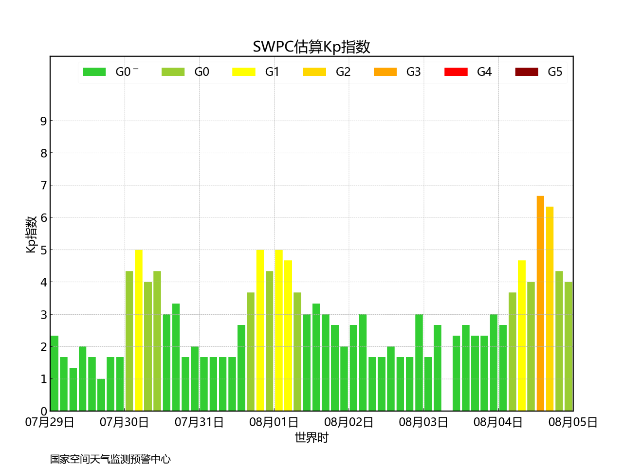 受日冕物质抛射活动影响,北京时间2024年8月4日20时到23时,地球发生了Kp指数为7的大磁暴,在接下来的三小时内地磁活动逐渐减弱为中等地磁暴,至8月5日凌晨2时,地磁暴过程结束。