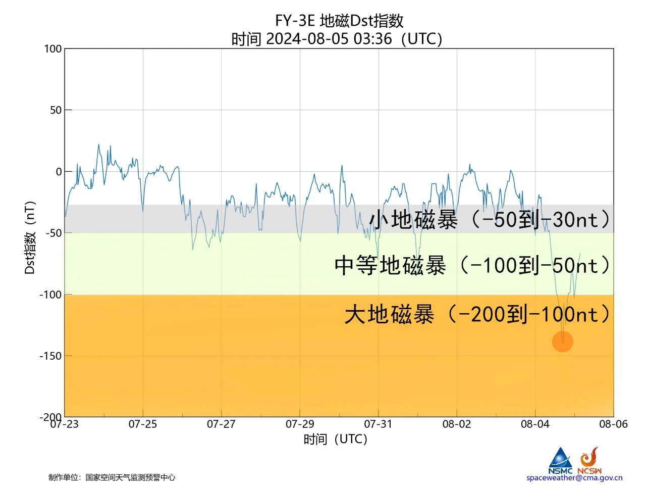 地磁暴发生的同时,处在太空中的风云三号E星同步探测到了这一过程。从它获取的Dst地磁指数来看,地球磁场出现了明显的变化,一度下探到接近-150nt的位置。