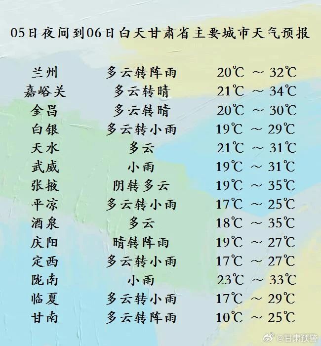 8月5日夜间到6日白天,河西五市晴或多云,祁连山区阴有阵雨或雷阵雨,省内其余地方多云,部分地方阴有阵雨或雷阵雨;