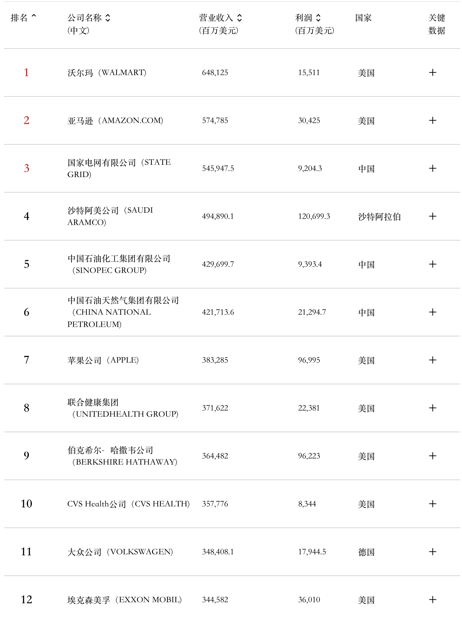 排行榜显示,按照营业收入计算,沃尔玛连续第十一年成为全球最大公司,营收6481亿美元,亚马逊重回第二,中国的国家电网公司继续位列第三,排在第四和第五位的分别是沙特阿美和中国石化,第6-10位依次为中石油、苹果、联合健康、伯克希尔、CVS、大众和埃克森美孚。榜单中一共有43家“新上榜和重新上榜”公司,在今年首次上榜公司中英伟达排名最高,位居第222位。中国公司中的奇瑞、杭州市实业投资集团和拼多多均为首次上榜。