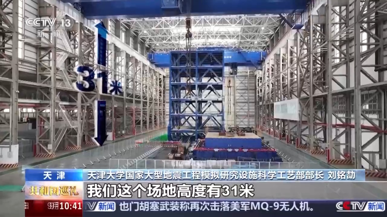 天津大学国家大型地震工程模拟研究设施科学工艺部部长 刘铭劼:我们这个场地高度有31米,跨度有43米,这部分区域的长度是120米。我们这个振动台台面尺寸20米乘16米,最大载重1350吨,大概是二十多辆重载卡车的重量。我们在满载情况下可以运行的最大加速度是2.0个重力加速度。这么大的加速度实际上已经超过了我们9度烈度条件下的地震动的水平。