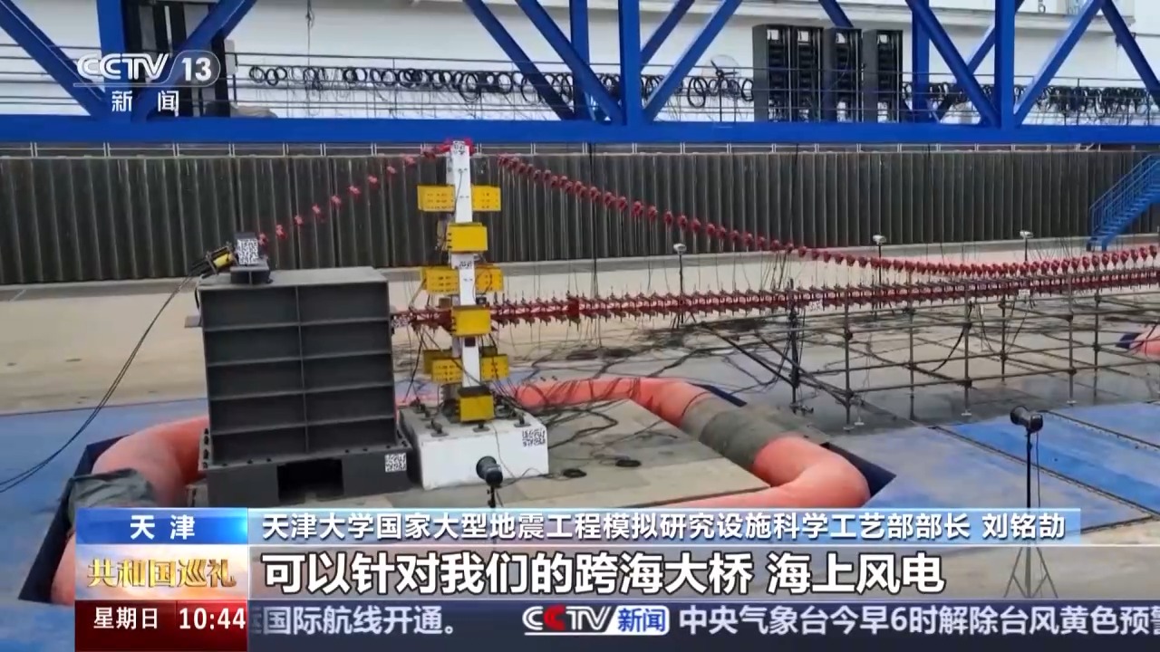 天津大学国家大型地震工程模拟研究设施科学工艺部部长 刘铭劼:我们这里面是世界上唯一的一套,可以实现水下双台地震、波浪、水流联合模拟的一个试验装置,可以在3米水深下工作,可以针对我们的跨海大桥、海上风电这些海上“超级工程”进行更加真实的地震模拟研究。