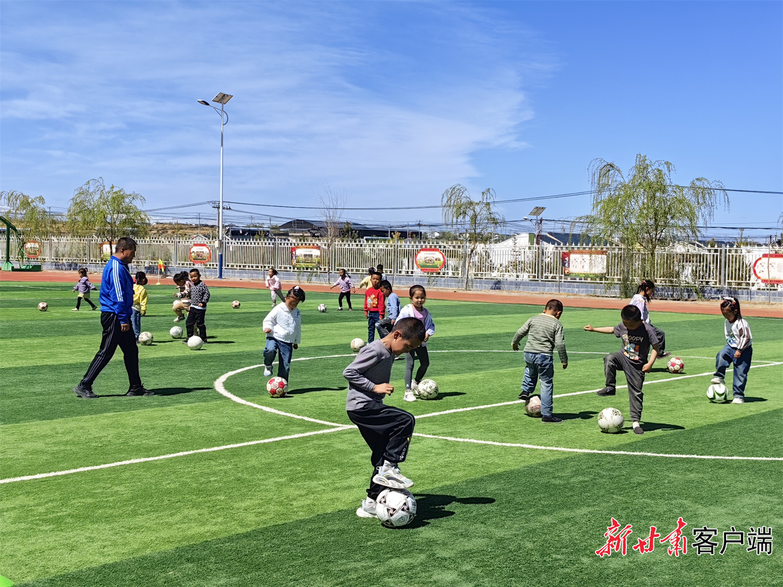 古浪县干城乡富民完全小学的学生们在操场上练习足球运球。