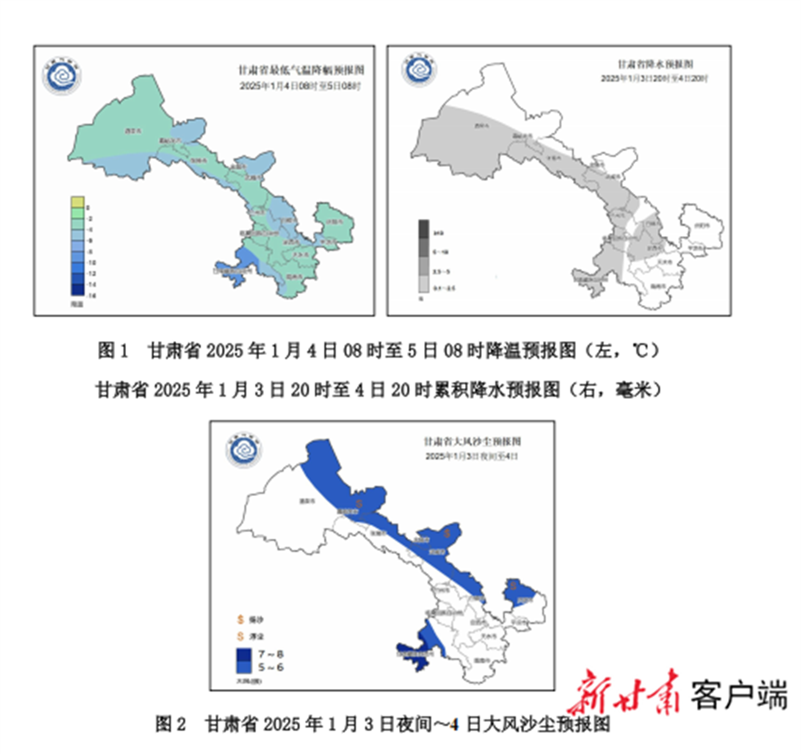 新甘肃客户端兰州1月2日讯(新甘肃·甘肃日报记者 海晓宁)记者今天从甘肃省气象局获悉,受冷空气影响,3日夜间至4日,我省将有一次降温、大风沙尘、降水天气过程。全省自西向东气温下降3至5摄氏度,甘南降幅可达6至8摄氏度;河西五市及甘南、白银市北部、庆阳市北部有5至6级西北风,其中甘南阵风可达8至9级,上述地区局部地方有沙尘天气;河西五市及陇中、甘南的部分地方有小雪。