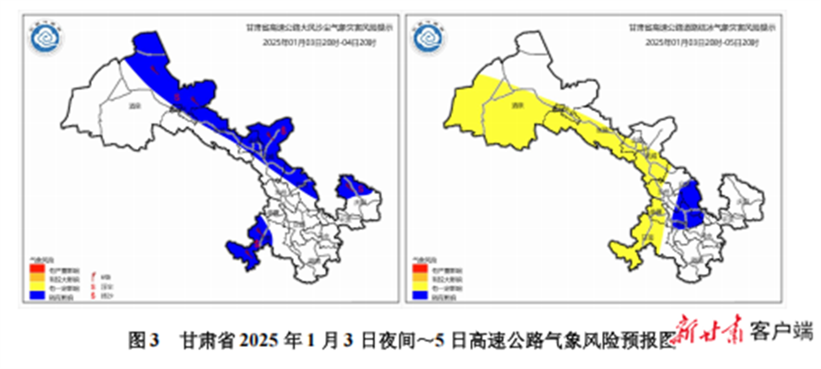 交通方面,预计3日夜间至4日受大风沙尘影响路段有:G7京新高速、G30连霍高速(嘉峪关-古浪段)、G6京藏高速(刘寨柯至白银段)、G2012定武高速、G1816乌玛高速(景泰至中川机场段)、S60西会高速、S38王夏高速、G1816乌玛高速(临夏至合作段)、G69银百高速(甜水堡至曲子);预计3日夜间至5日受降雪、道路结冰影响路段有:S63柳敦高速、G3011柳格高速、G30连霍高速(柳园至星星峡段、瓜州-永登段)、G0611张汶高速、G3017金武高速、S17金永高速、S55北仙高速、G1816乌玛高速(临夏至合作段、康家崖至临夏段)、S34双达高速、S32临大高速、S38王夏高速。出行请注意防范。