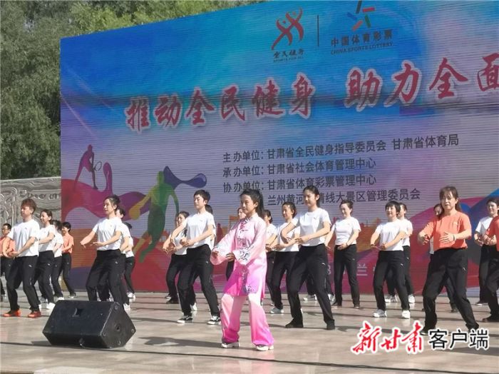 朱红燕(中)参加2020年甘肃省全民健身日活动,带领社会体育指导员进行功法展演。