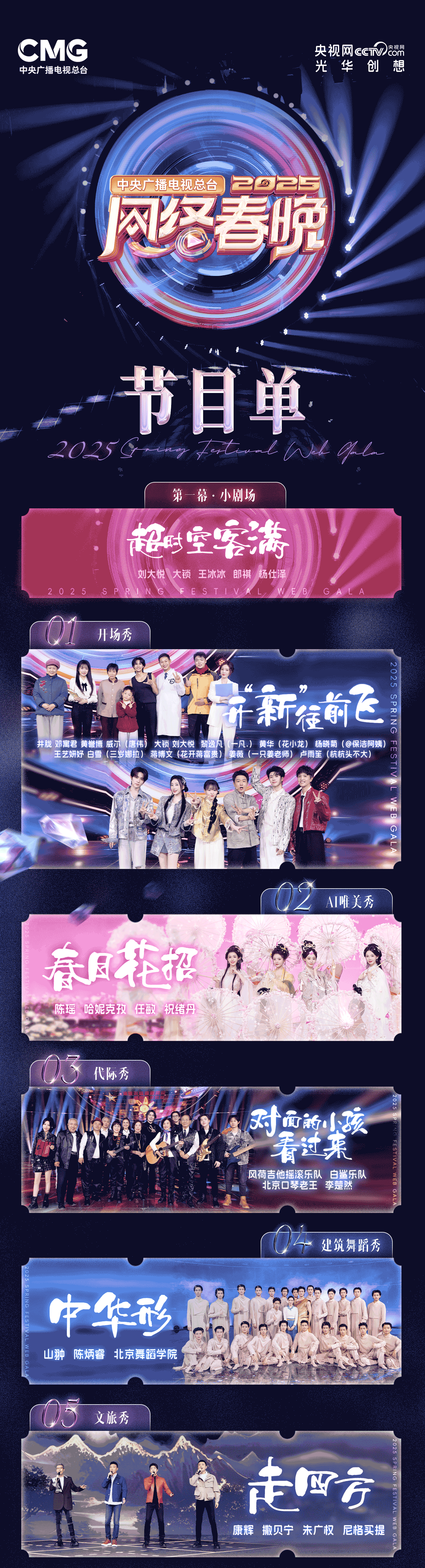《中央广播电视总台2025网络春晚》 节目单抢先看!今晚8点档,CCTV-1综合频道、CCTV-3综艺频道及央视新闻、央视网、央视频等总台新媒体矩阵同步播出。