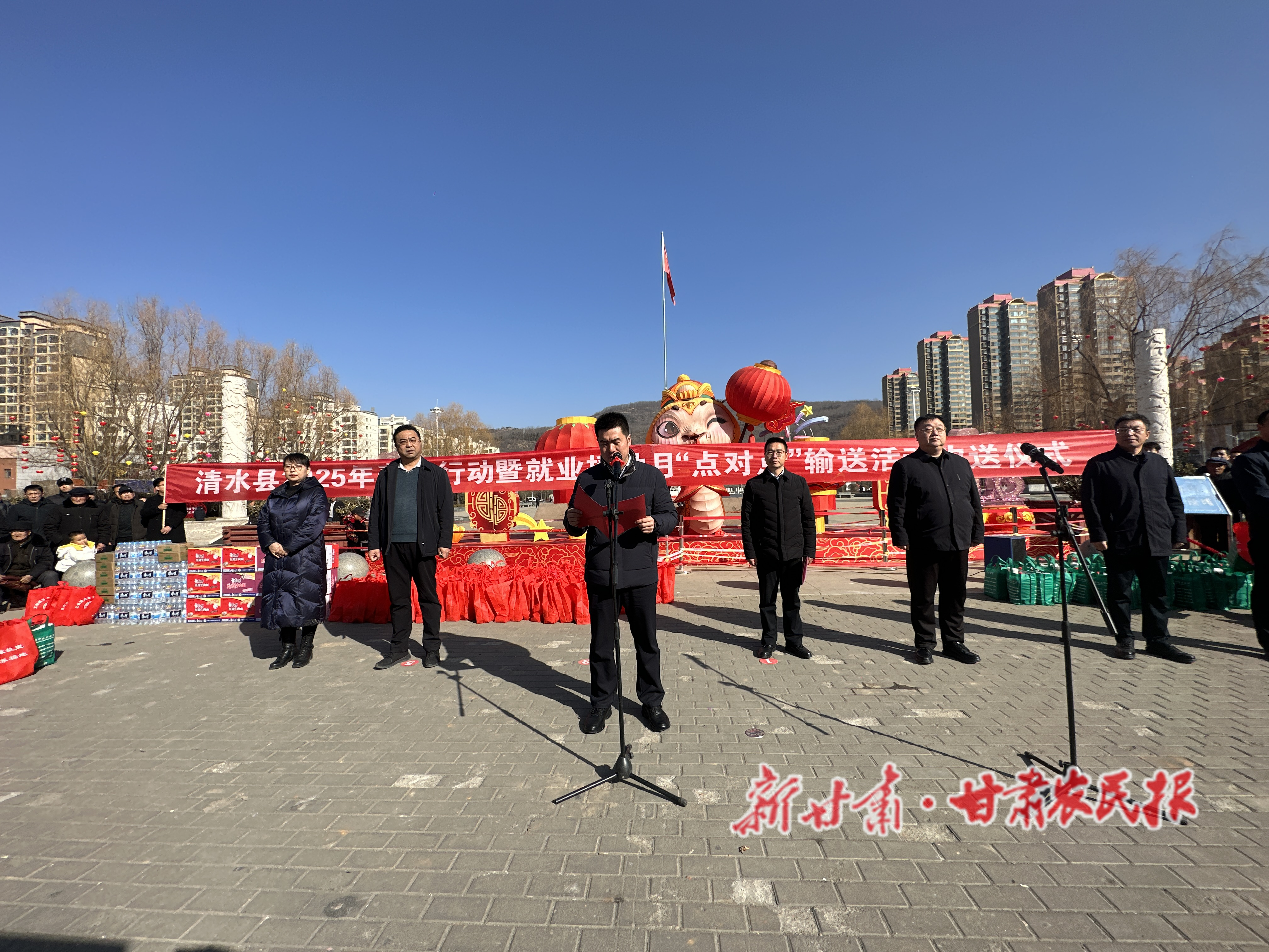 欢送仪式上,清水县委、县政府为“点对点”有组织输转的150名外出务工人员赠送了包含矿泉水与方便面等物资的爱心礼包,向即将外出务工的乡亲们致以新春的祝福和诚挚的问候。