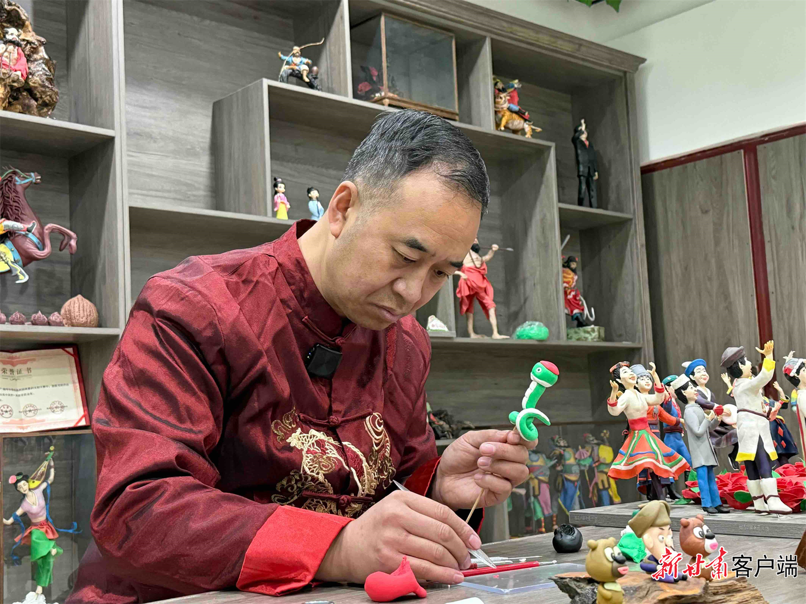 很快,小蛇的身体初具雏形,他拿起工具,小心翼翼地刻蛇身细节,每一道纹路都清晰细腻。紧接着,他用红色颜料点睛,刹那间,小蛇活灵活现。安秋平捧着完成的小蛇,笑着祝福:“借这条面塑小蛇,祝大家蛇年大吉,生活充满活力!”