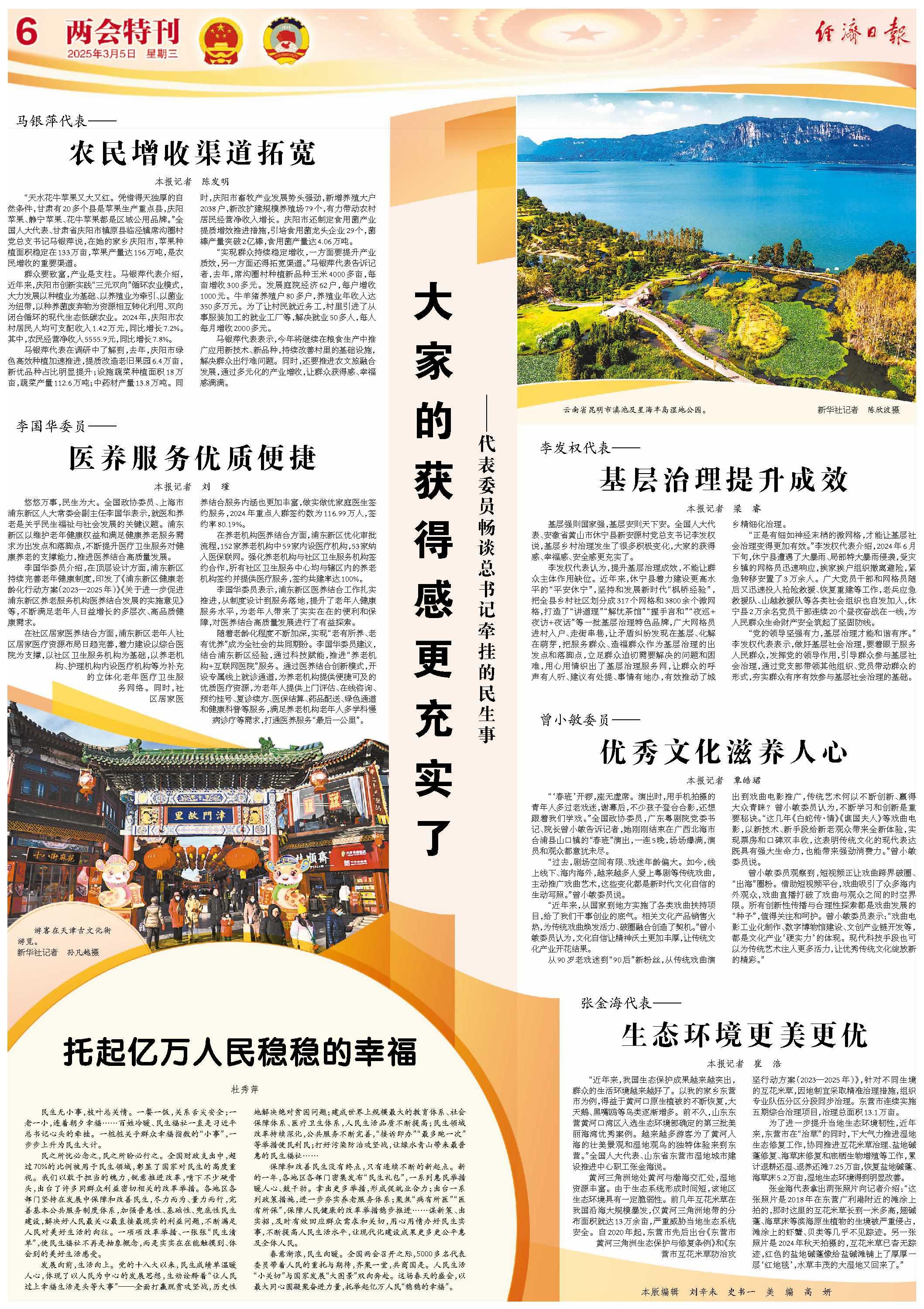 马银萍代表表示,今年将继续在粮食生产中推广应用新技术、新品种,持续改善村里的基础设施,解决群众出行难问题。同时,还要推进农文旅融合发展,通过多元化的产业增收,让群众获得感、幸福感满满。