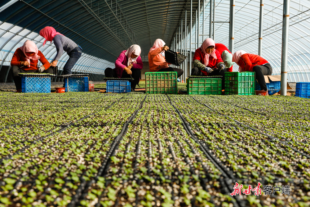 3月1日,古浪县永丰滩镇益民蔬菜育苗中心的大棚里,工作人员正忙碌着挑选、养护种苗,为春耕生产提供优质种苗。新甘肃·甘肃日报通讯员 许吉年