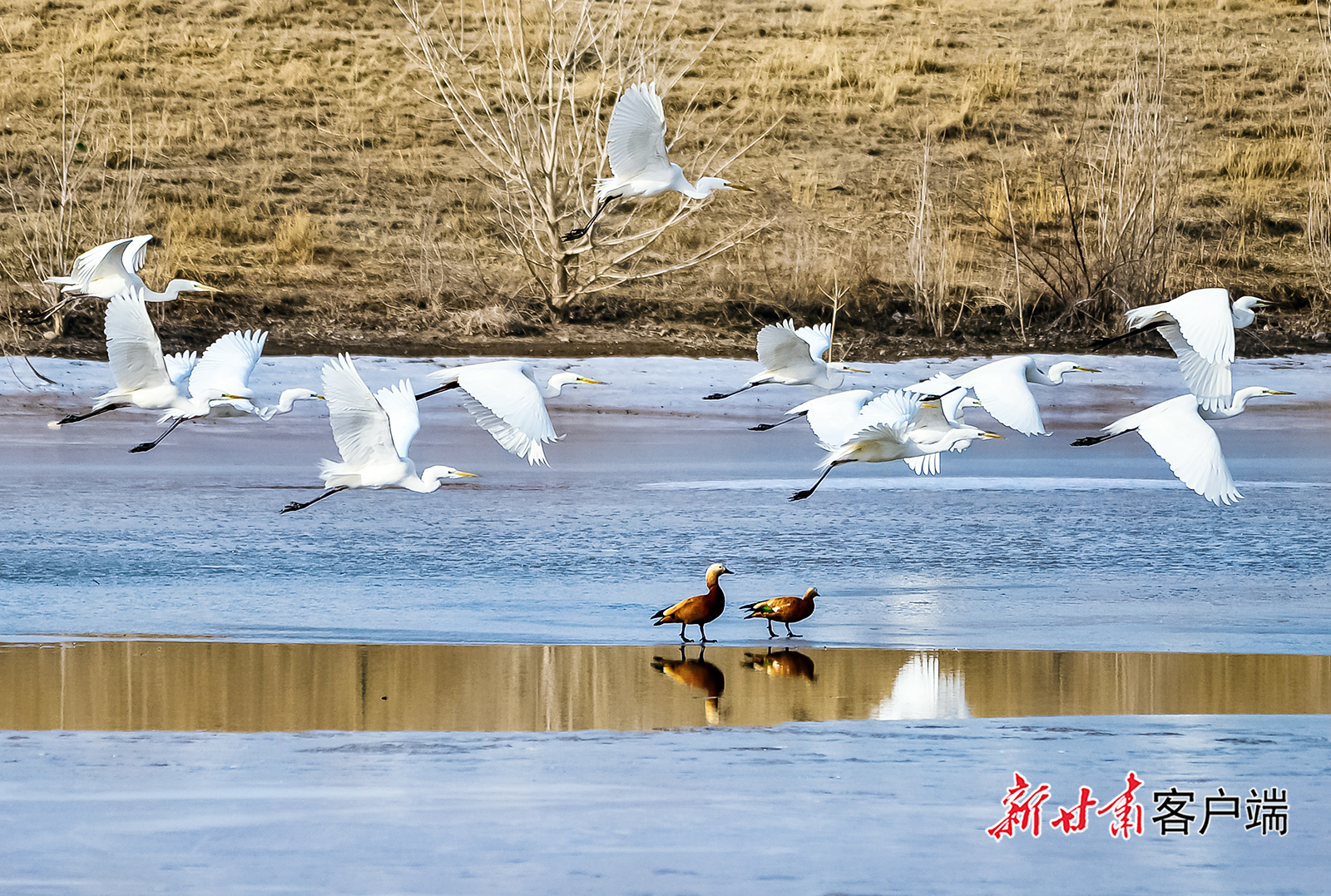 3月1日,敦煌鸣沙山下的党河湿地大批白鹭飞舞、觅食。为早春的敦煌大漠增添了春天的气息。新甘肃·甘肃日报通讯员 王斌银 周玉玲