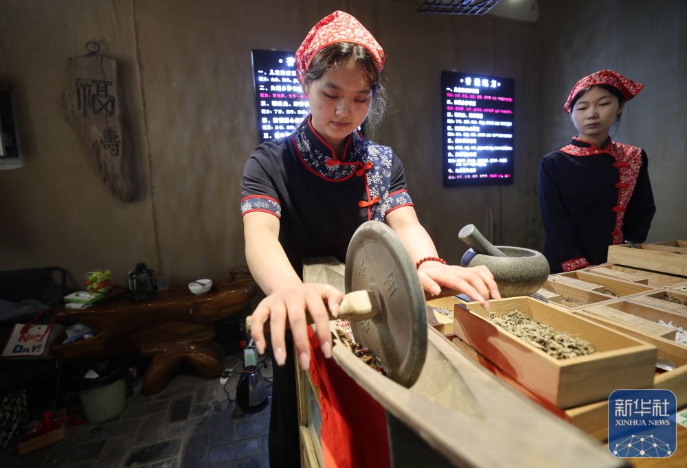 ↑ 5月24日,在山东省临沂市沂南县铜井镇竹泉村,传统手工艺人在捣碎中药材,准备制作香囊。新华社发(王彦冰摄)