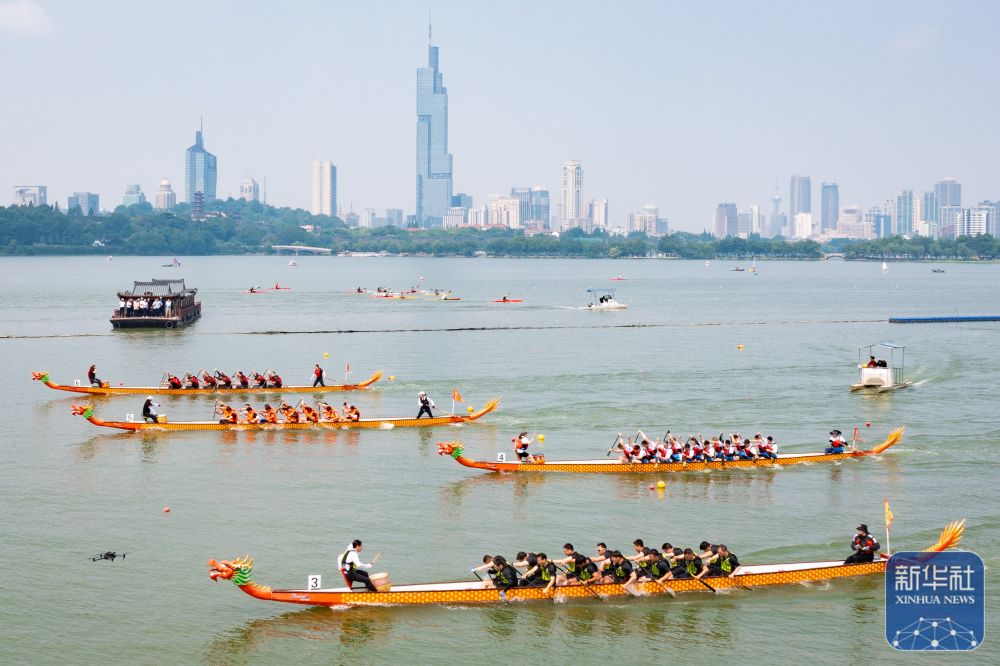 ↑ 5月24日,龙舟队伍在南京玄武湖上竞逐(无人机照片)。新华社发(苏阳摄)