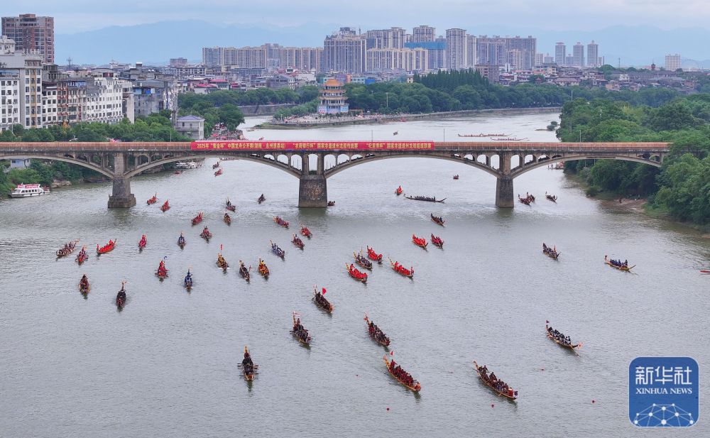 ↑ 5月22日,龙船在湖南省永州市道县县城潇水河面划行备战(无人机照片)。新华社发(何红福摄)