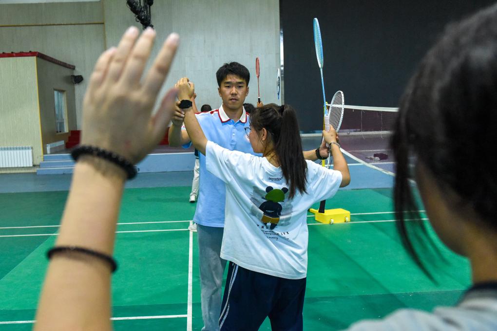 新疆阿勒泰地区第一高级中学室内羽毛球场内,研支团体育老师兴旺(中)教学生们打羽毛球。新华社记者 高晗 摄