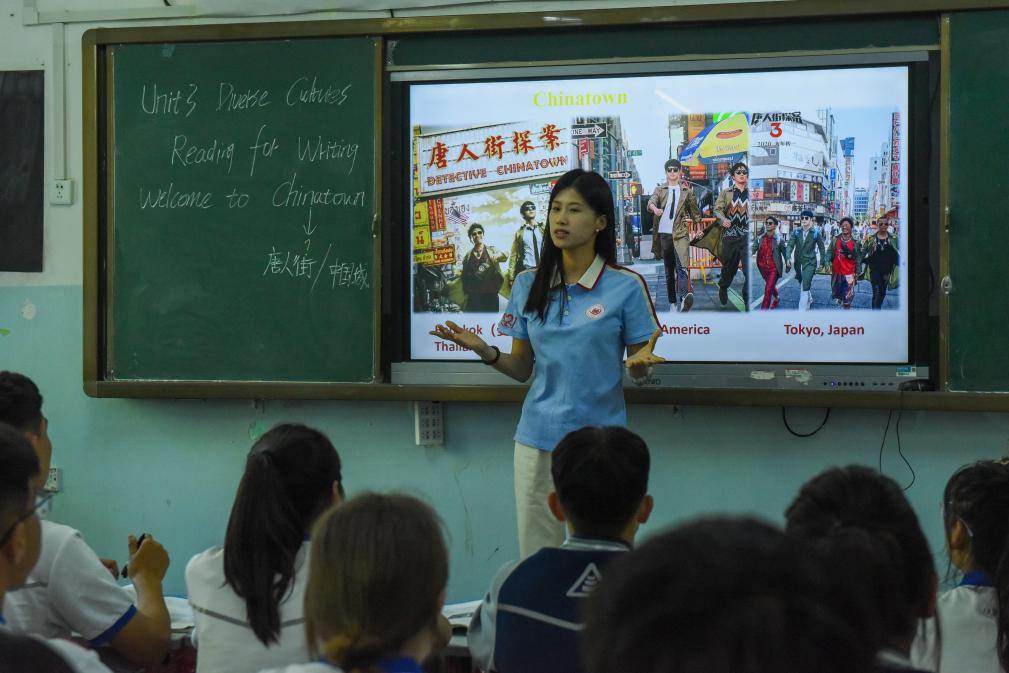 英语老师朱明静以爱国电影为主题讲授英语课。新华社记者 高晗 摄