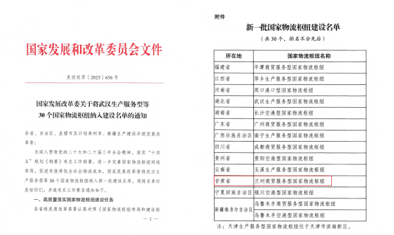 近日,国家发展改革委正式印发通知,将兰州商贸服务型国家物流枢纽等30个国家物流枢纽纳入新一批建设名单。