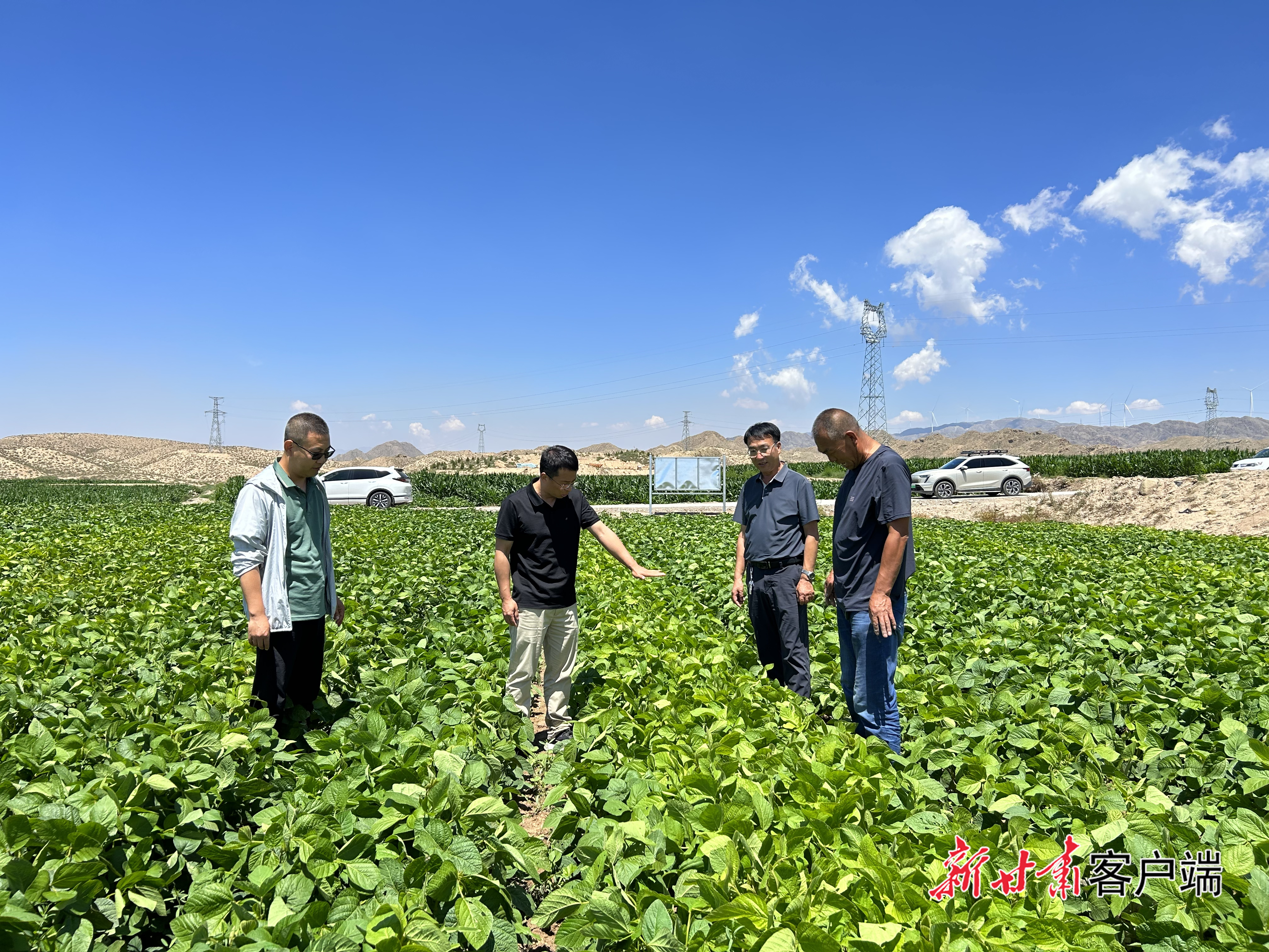 专家组在平川区宝积镇小川村观摩大豆生长情况。