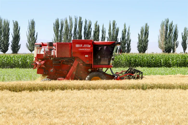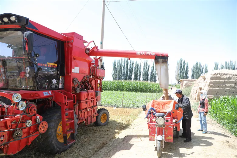走进合黎镇五二的一处麦田,金黄的麦穗将麦秆深深压弯,长势十分喜人。一台台联合收割机在田间穿梭作业,一簇簇麦穗被卷入机舱,割麦、脱粒、清选一气呵成,色泽金黄、颗粒饱满的麦粒从卸粮口倾泻而下,快速又高效。