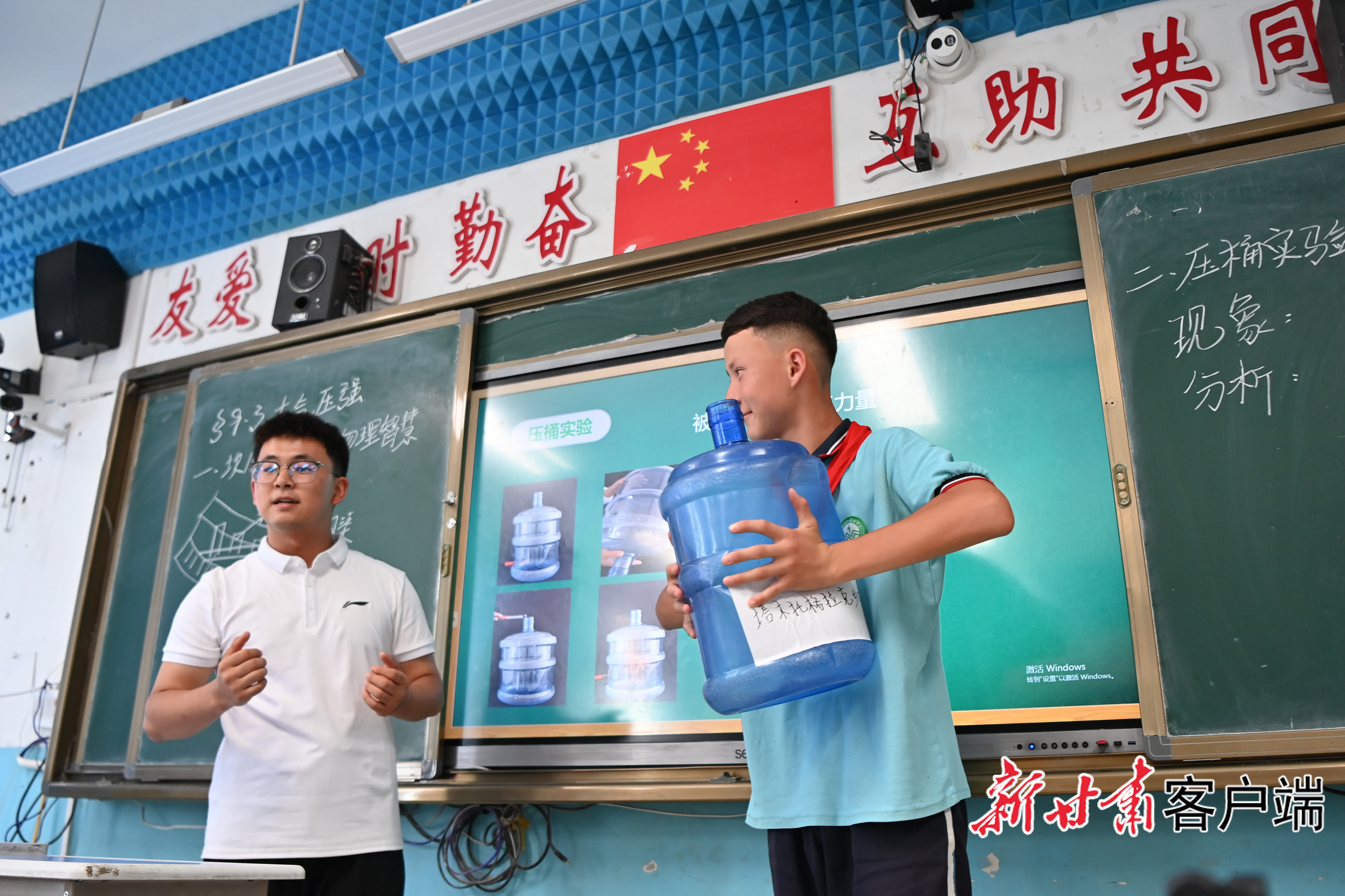 课堂上,马俊龙就像一位神奇的魔法师。在讲解“大气压”这个章节时,他用水桶、酒精做实验,让学生感受到大气压强的存在,实验中燃烧的火苗引来同学们阵阵惊叹!单手压扁水桶的奥秘、坎儿井的构造原理,在他的讲解中学生们豁然开朗。
