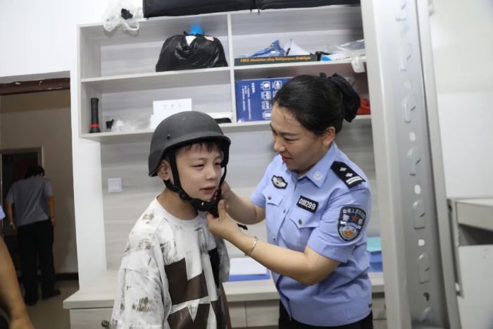 在警用装备室,警用盾牌、警棍、手铐、防刺服和防弹衣等装备一字排开,民警耐心地为孩子们讲解每一种装备的用途和使用方法。