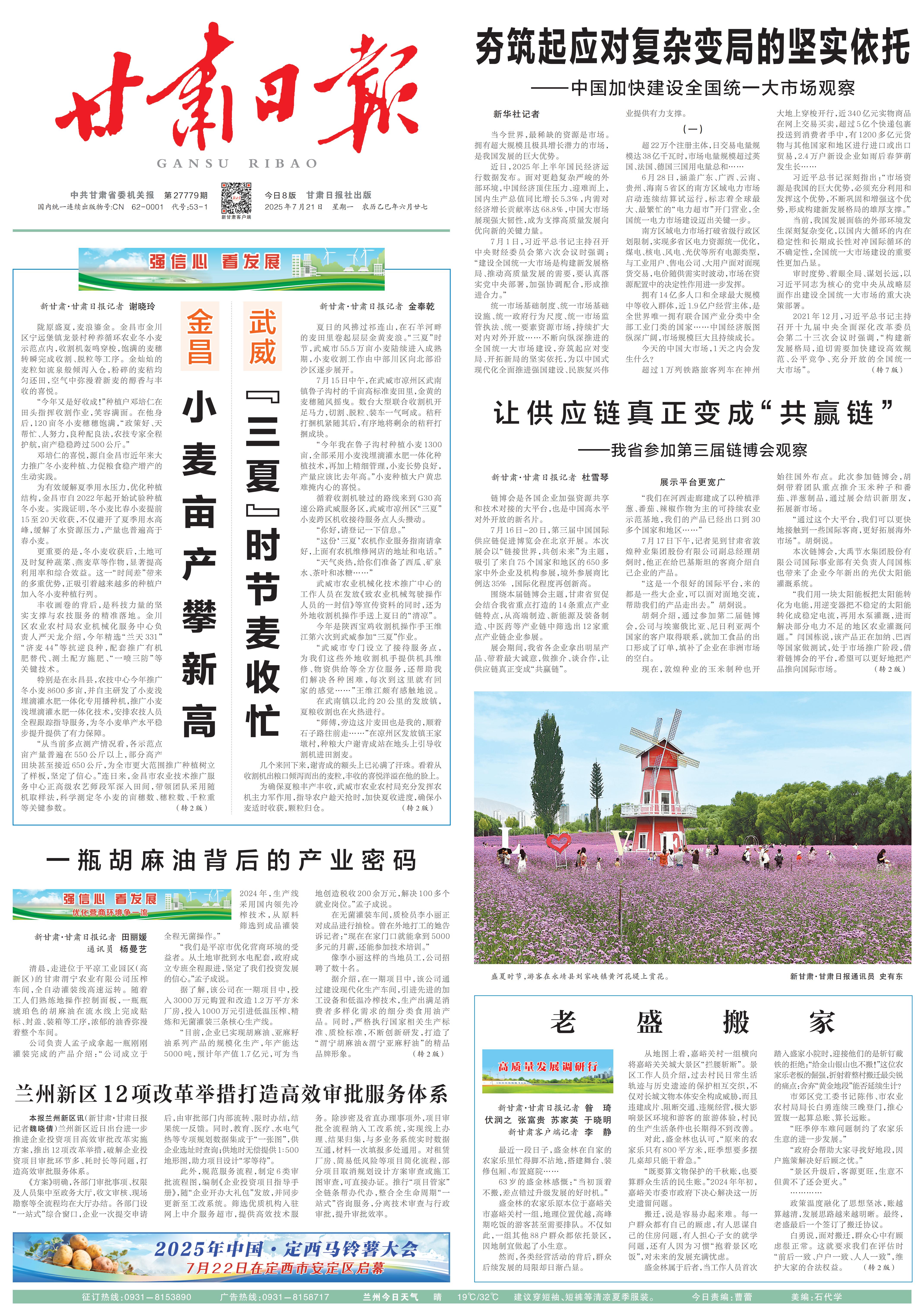 7月15日中午,在武威市凉州区武南镇鲁子沟村的千亩高标准麦田里,金黄的麦穗随风摇曳。数台大型联合收割机开足马力,切割、脱粒、装车一气呵成。秸秆打捆机紧随其后,有序地将剩余的秸秆打捆成块。