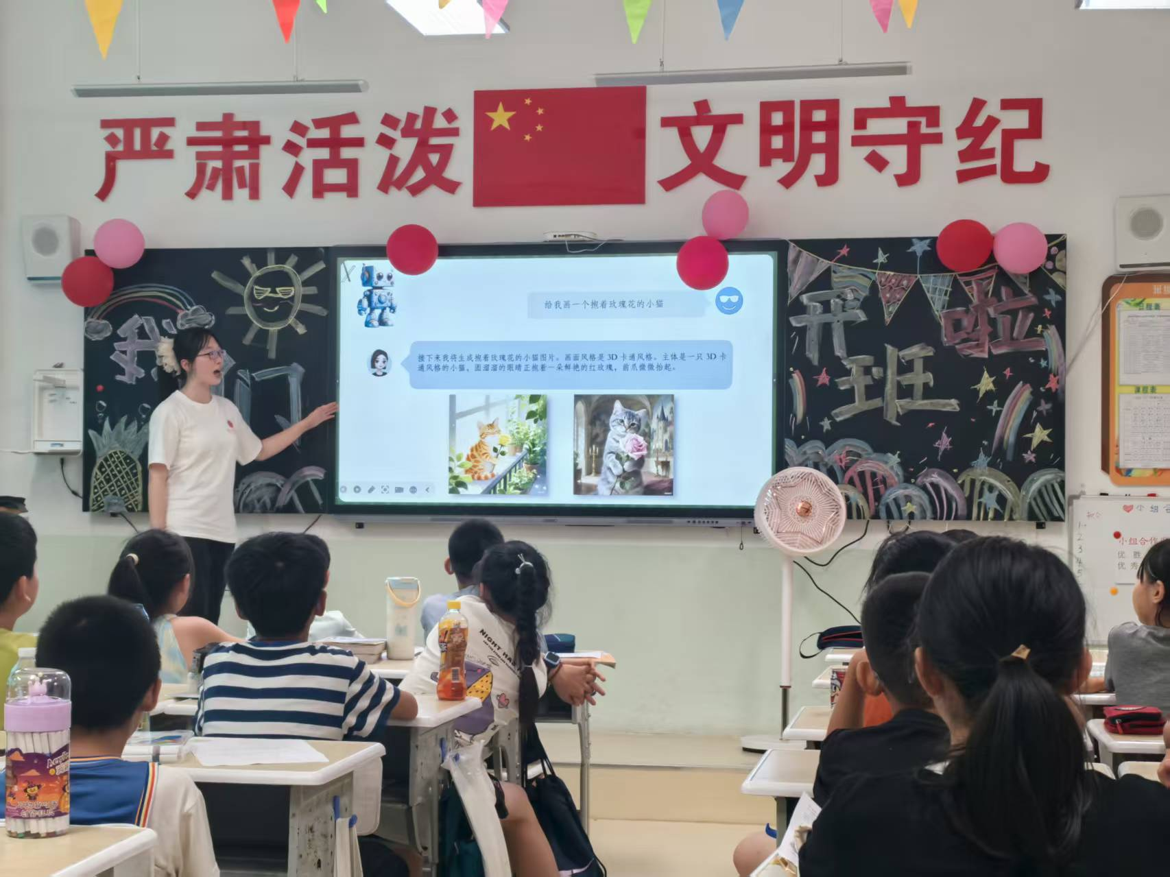 两当县金洞小学副校长周霄说:“把小学生的图画或文字描述通过AI变成形象的图片,课堂教学生动有趣,比单纯的讲更能让小学生记住AI的样子,让小学生觉得AI并不遥远、梦想并不遥远。实践团队员有活力,课堂带动性强,希望这种大朋友带小朋友的教学多多开展。”(通讯员:李富彦 惠赴凯 陈尚宾 燕黎宁)