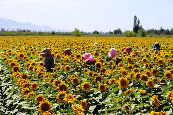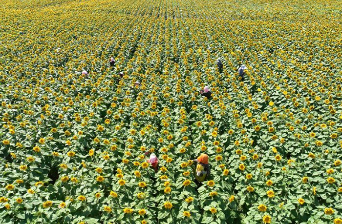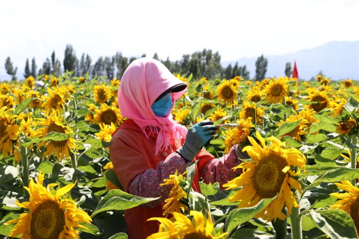 今年以来,五三村积极调整农业产业结构,探索“合作社+村集体+农户+订单”的发展模式,不仅为村集体带来了可观的经济效益,也为村民铺就了家门口的致富路。制种葵花管理环节多、用工需求大,村里将富余劳力组织起来,变身“产业工人”。这片花海催生的“门口经济”,真正实现了村民“务工不出村、挣钱不离家”。