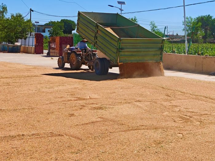 在数百平方米的晾晒场上,麦粒被划分成整齐的“方块”,农户们手持木耙来回翻动,让每一粒麦子都能充分接受阳光的“洗礼”。农户王建国驾驶着拖拉机,正将刚从收割机卸下的小麦均匀铺在水泥晾晒场上。“今年雨水充足、光照适宜,小麦亩产比去年提高了近50斤。这麦子晒透了,磨出的面粉才够筋道。”他擦了擦额头的汗珠,脸上洋溢着藏不住的笑意。