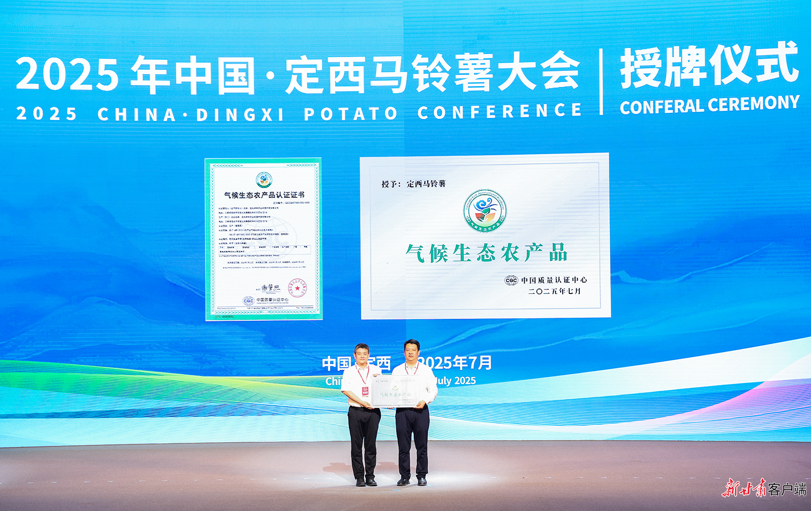 中国质量认证中心授予定西马铃薯“气候生态农产品”认证证书及牌匾。新甘肃·甘肃日报记者 冯乐凯摄