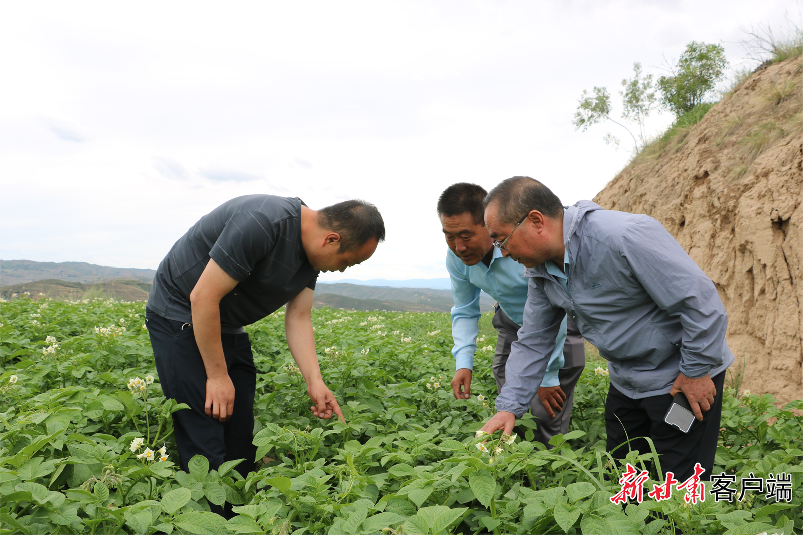 市农技站站长和马铃薯种植基地负责人与市气象局工作人员探讨马铃薯长势。