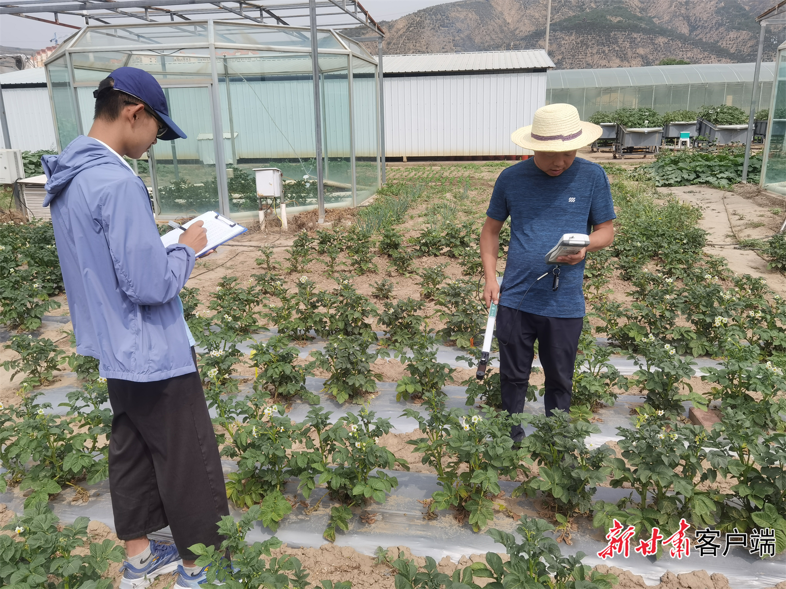 定西市农业气象试验站工作人员在测定马铃薯叶面积指数。
