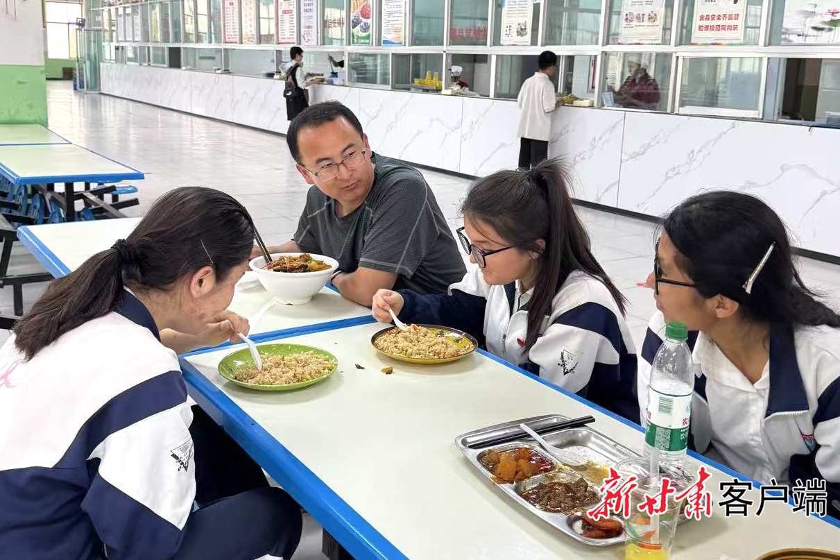 张建平(左二)和学生们一起在学校食堂吃饭。