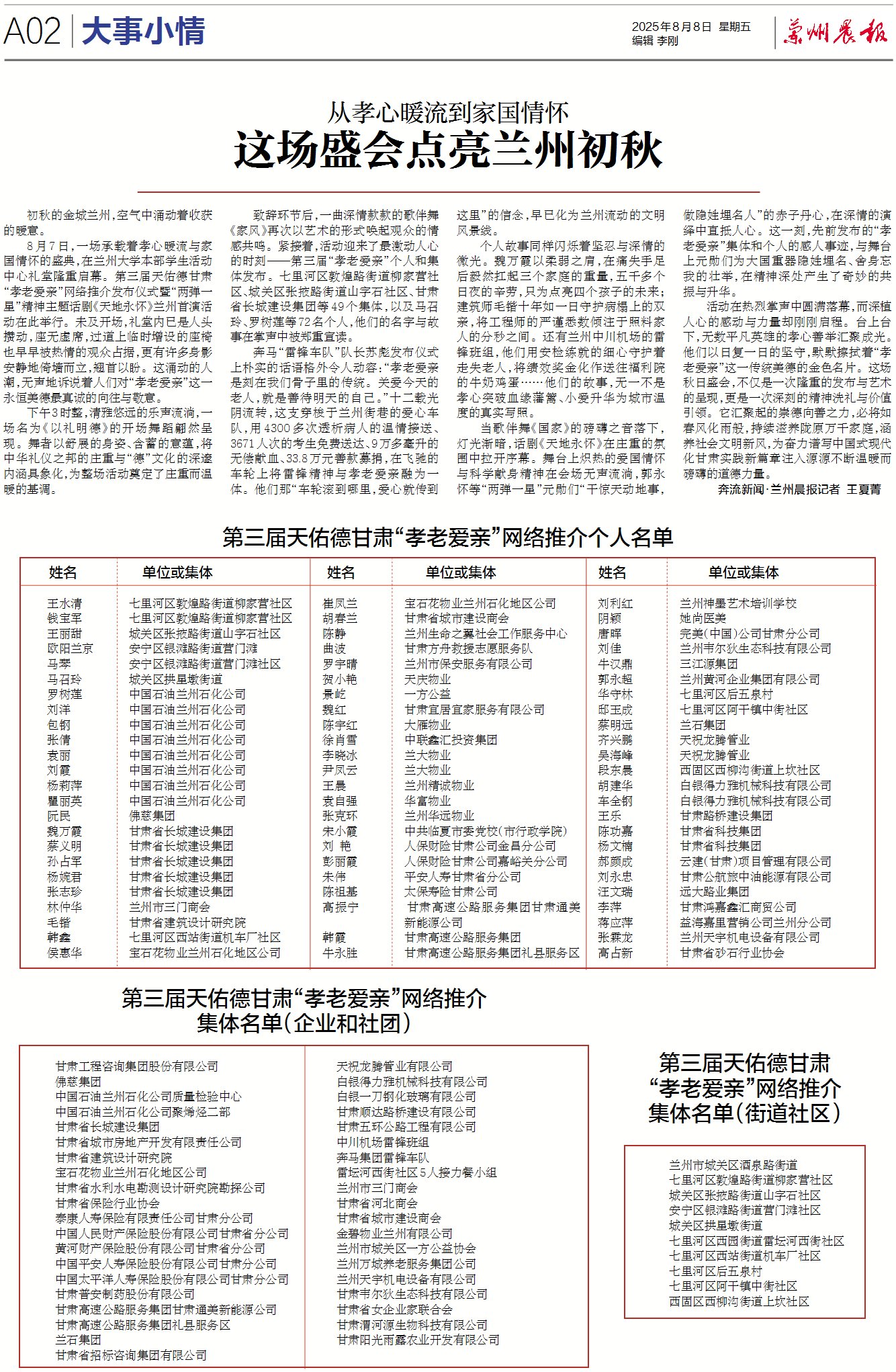 个人故事同样闪烁着坚忍与深情的微光。魏万霞以柔弱之肩,在痛失手足后毅然扛起三个家庭的重量,五千多个日夜的辛劳,只为点亮四个孩子的未来;建筑师毛锴十年如一日守护病榻上的双亲,将工程师的严谨悉数倾注于照料家人的分秒之间。还有兰州中川机场的雷锋班组,他们用安检练就的细心守护着走失老人,将绩效奖金化作送往福利院的牛奶鸡蛋……他们的故事,无一不是孝心突破血缘藩篱、小爱升华为城市温度的真实写照。