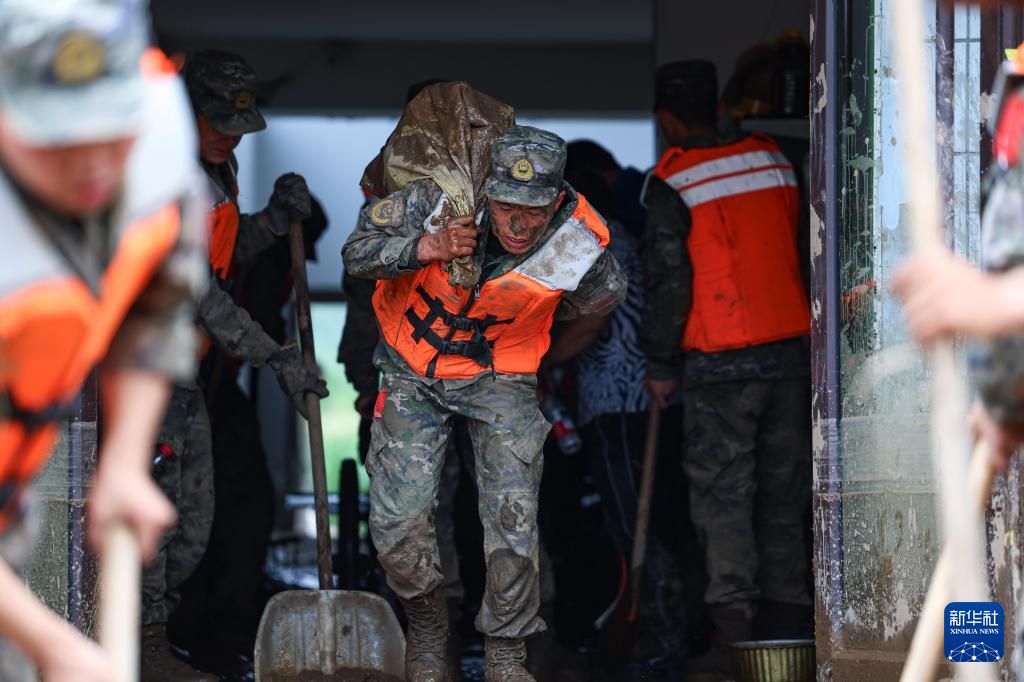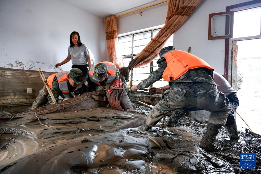 8月9日,武警甘肃总队机动支队官兵在兰州市榆中县城关镇兴隆山村受灾村民家中清理淤泥。