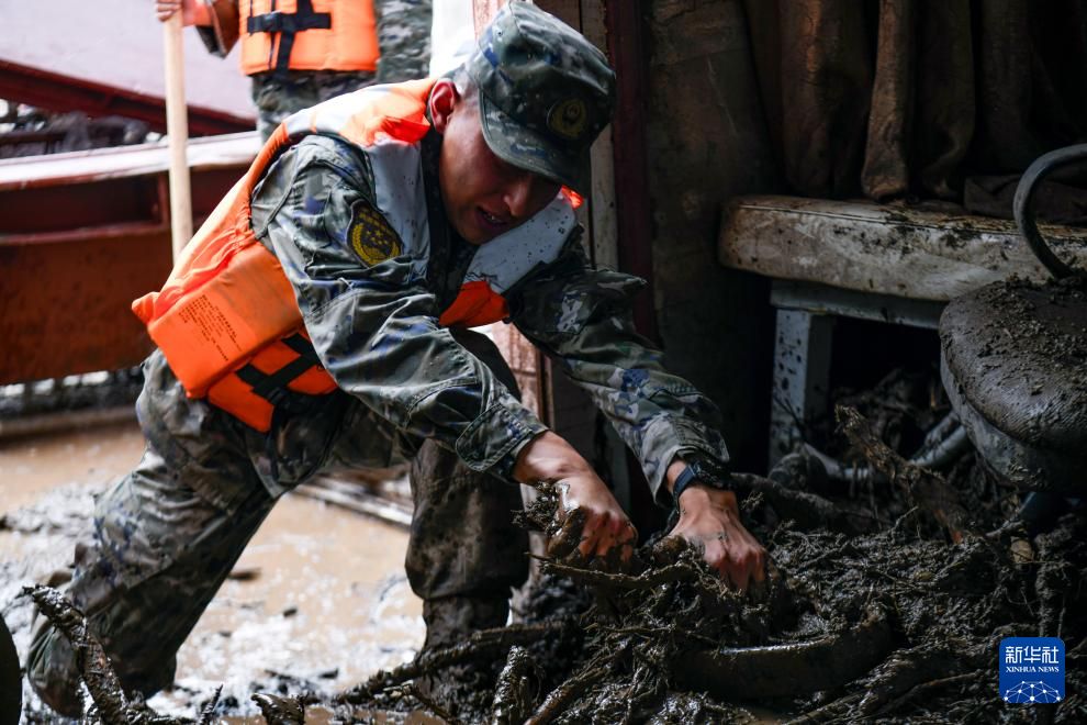8月9日,武警甘肃总队官兵在兰州市榆中县马莲滩村、兴隆山村、新营镇、小康营乡、旧庄沟村等5个方向,展开转移被困群众、转运受损车辆、清理淤泥等任务。