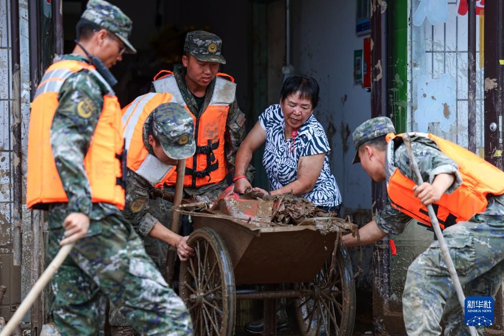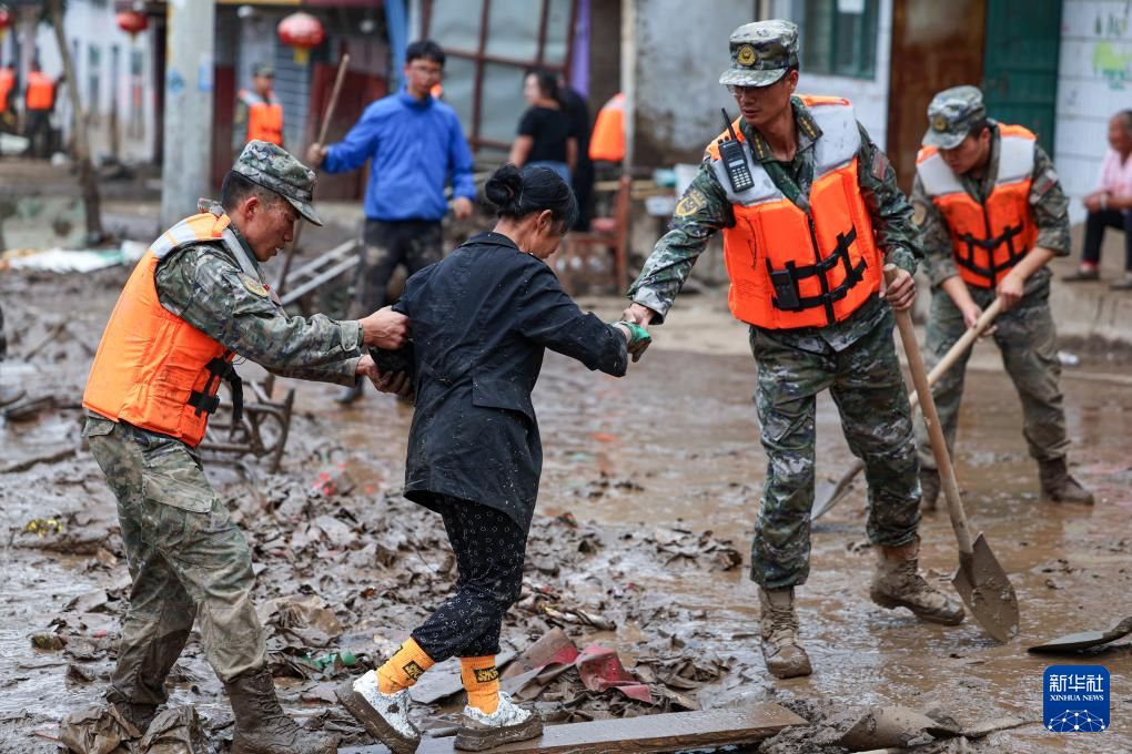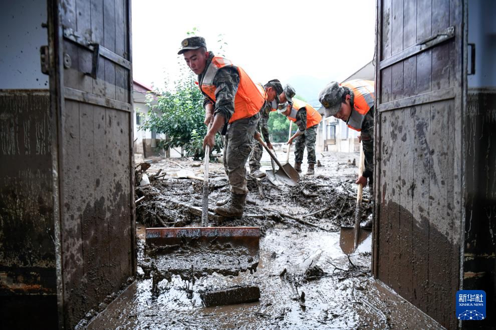 8月9日,武警甘肃总队机动支队官兵在兰州市榆中县城关镇兴隆山村清理杂物。
