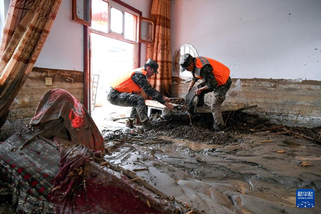 8月9日,武警甘肃总队机动支队官兵在兰州市榆中县城关镇兴隆山村受灾村民房间内清理杂物。