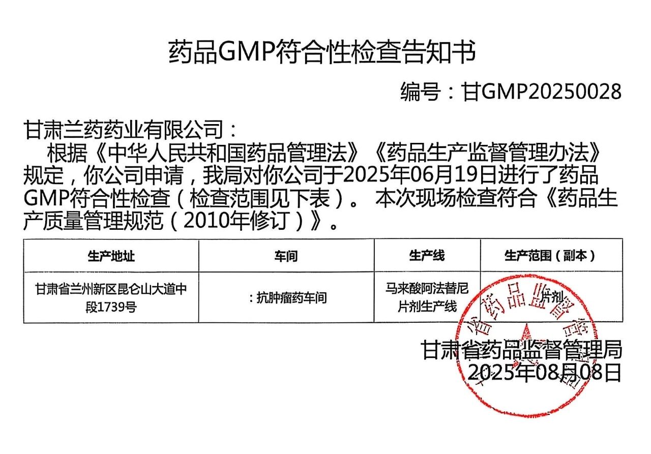 新甘肃客户端讯(新甘肃·兰州新区报记者 霍鸿宇)近日,石化集团兰药药业公司研发的靶向抗肿瘤药马来酸阿法替尼片,顺利通过生产质量管理规范(GMP)符合性检查,取得省药品监督管理局药品生产质量管理规范(GMP)告知书。